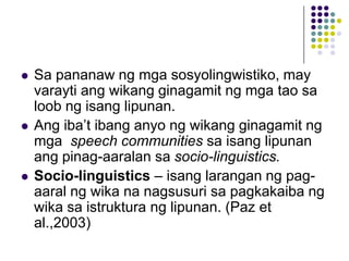 Scribd is the worlds largest social reading and publishing site. Ang ganitong pagkakaiba sa mga katawagan at kahulugan ng salitang ginagamit sa ibang lugar ang tinatawag nating heograpikal na varayti ng wika. Aralin 2 gçô ang wika at lipunan 1.